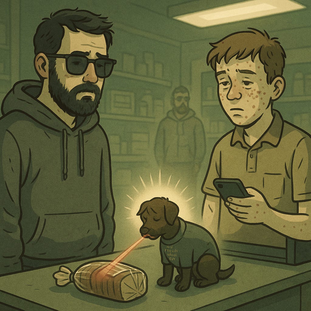 Pas sur le chien qui lèche l’invisible.
