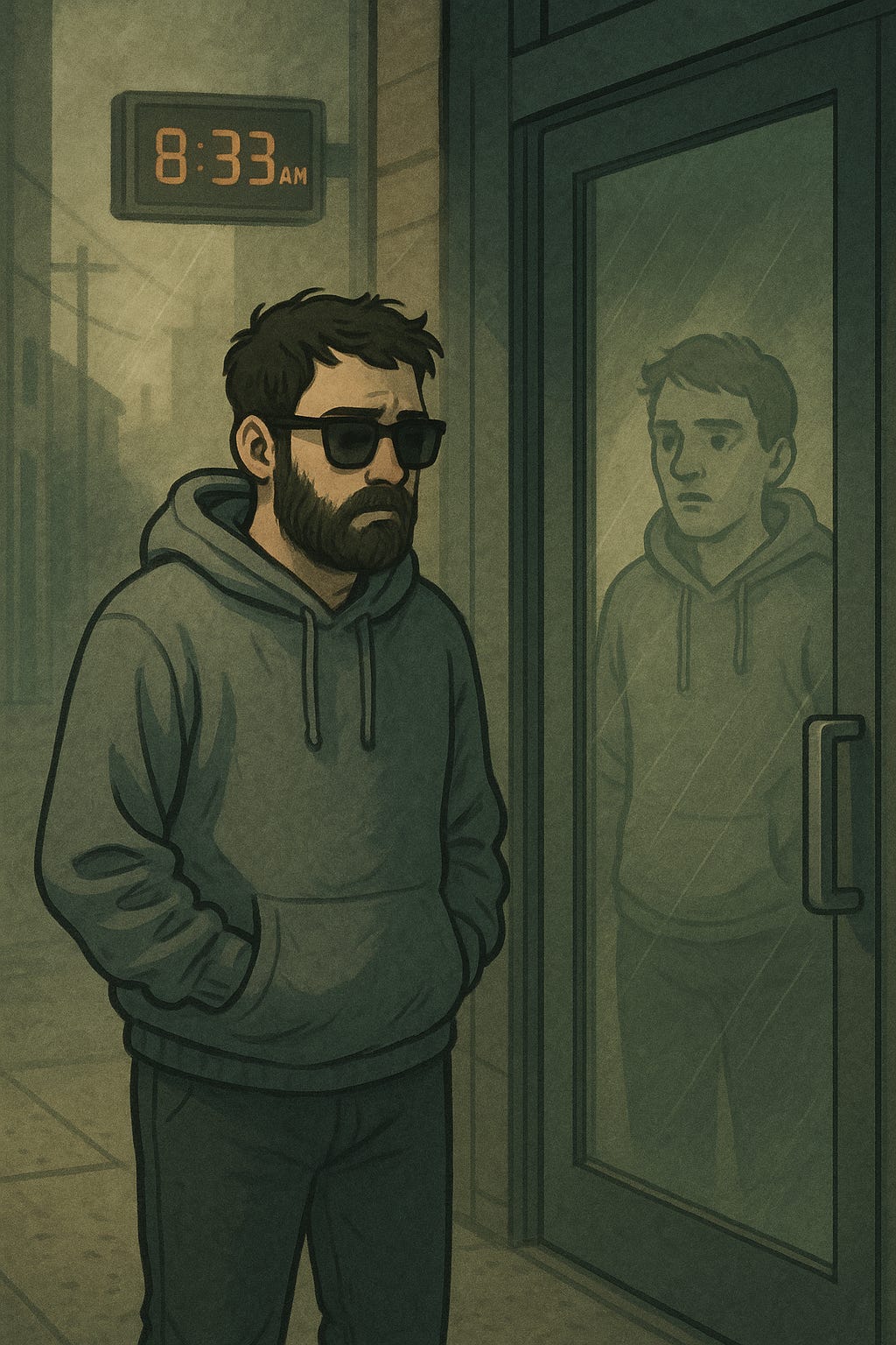 Tu vérifies ton reflet dans la porte vitrée.